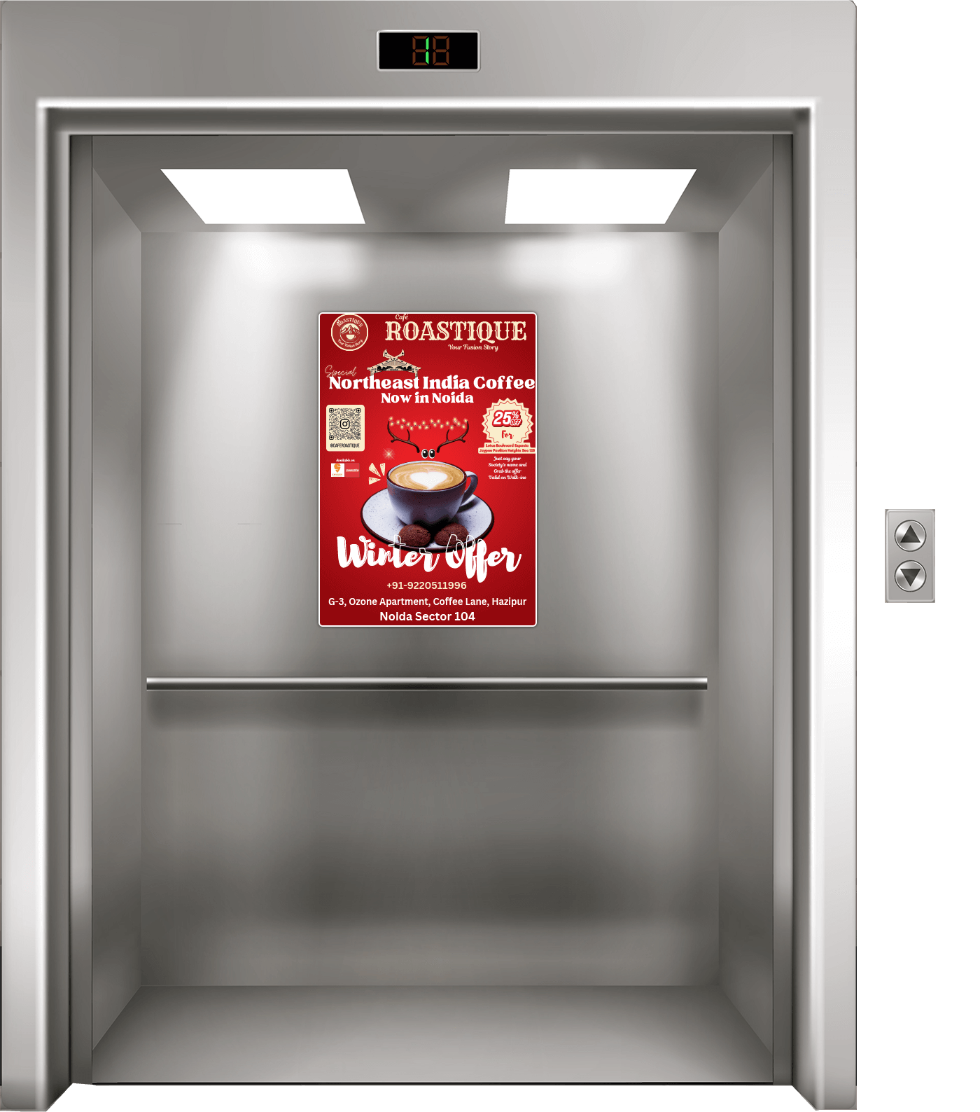 We provide advertisement space inside the elevators of a residential complex with a maximum poster of size 13”X19”. These ads are strategically placed to capture the attention of users, enabling communication of the entire ethos of the brand within a few seconds. Further, it also increases the recall and conversion rate owing to the captive environment. The buyer using a promo code displayed on the advertisement can help to evaluate the returns on promotion.